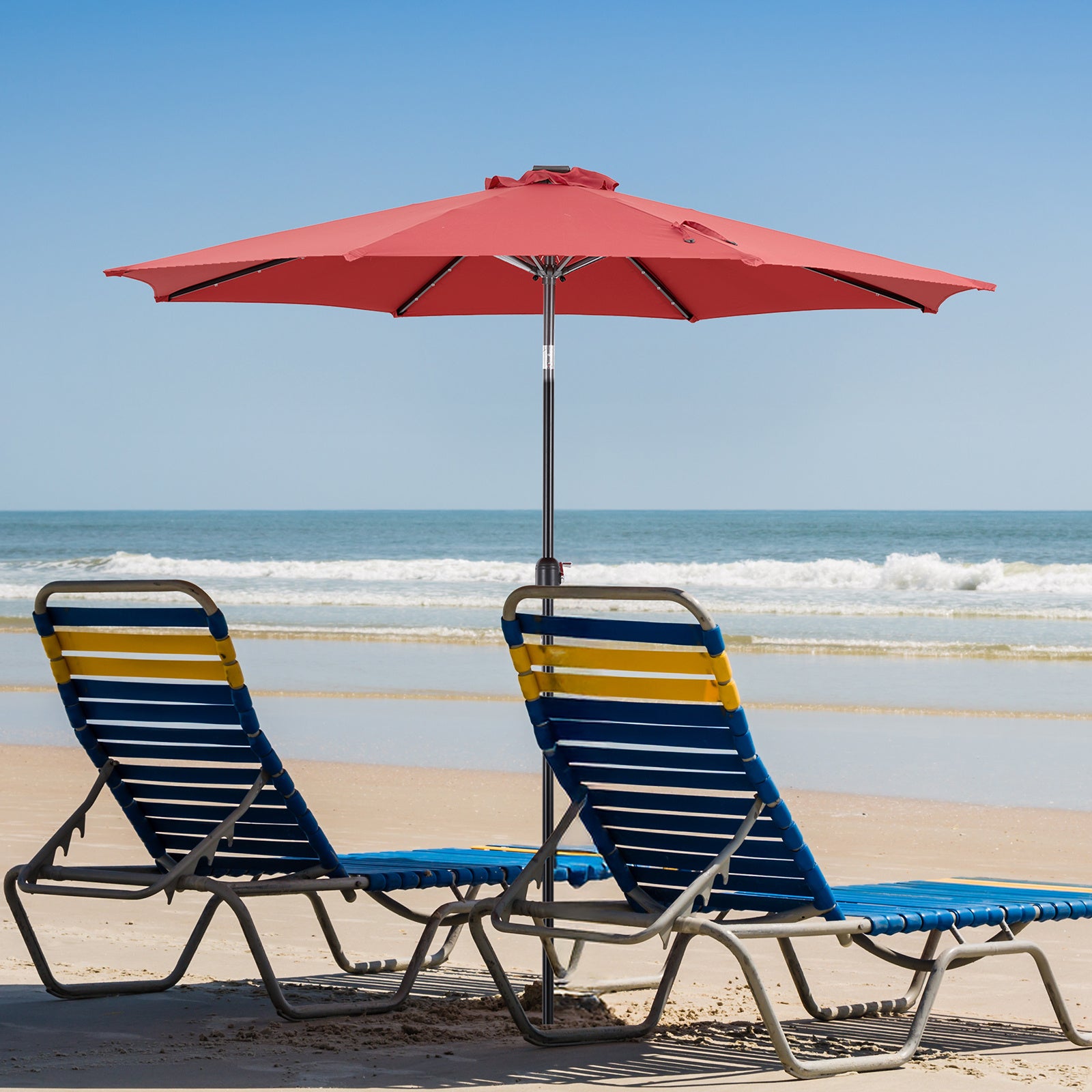 - 32 Solar-Powered LED Lights: Each outdoor umbrella rib has 4 solar LED lights, powered by a top solar panel. Fully charged, they last 6-8 hours. A switch on the pole controls the lights. It's ideal for evening parties.