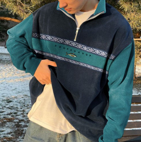 2022 autumn cross-border large size retro splicing zipper British sweatshirt daily outdoor casual top