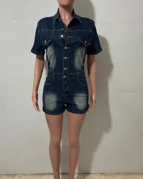 Women's Casual High Stretch Short Sleeved Slim Fit Denim Jumpsuit